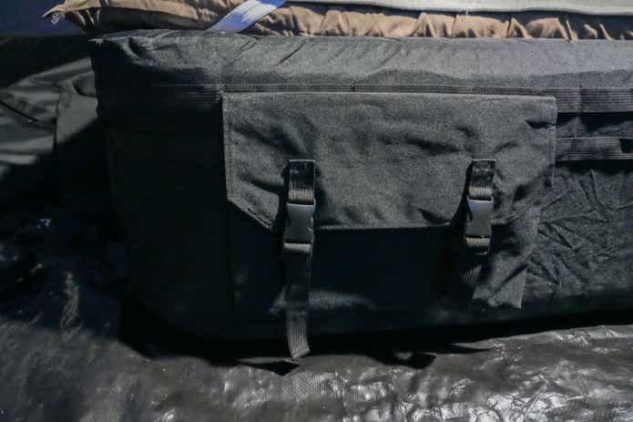 エアーを抜くと、なんとなく折り目が残っているので、それに従って畳んで収納袋に入れておしまいです(設置時に広げる手順を覚えておいて、片付けのときはその逆で畳むと楽です)。