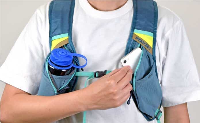 メッシュポケットは深さがあり、高さのあるボトルも安定して収納できました。もう一方のジッパー付きポケットは、パッカブルジャケットや折りたたみ傘などマルチに使えるため、実用性も十分です。