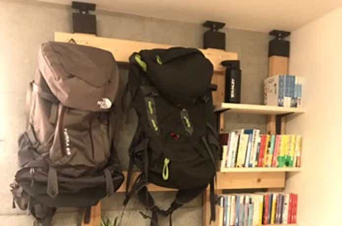 大きいサイズのバックパックは吊り下げて収納するのが一番。右サイドには小さな棚板を追加して本もたくさん収納できています。