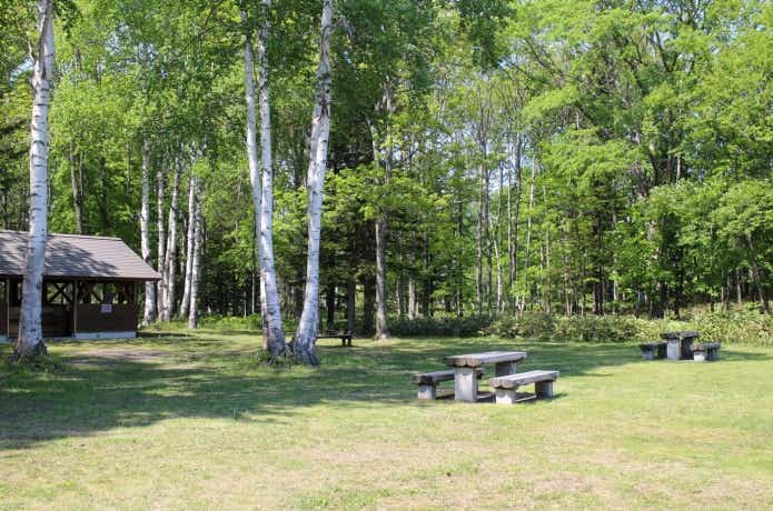 道民の森一番川オートキャンプ場は、北海道当別町の深い森に囲まれたキャンプ場。各オートサイトには流し台と木製テーブルが備え付けられ、食器をその都度炊事場まで洗いに行く必要がありません。