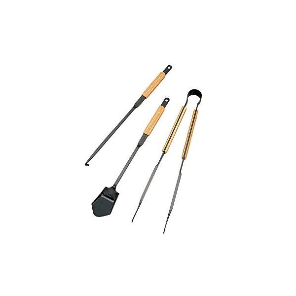 火かき棒、灰処理に便利なショベル、薪や炭を掴むトングと、焚き火に使うツールがセットになっている優れもの。