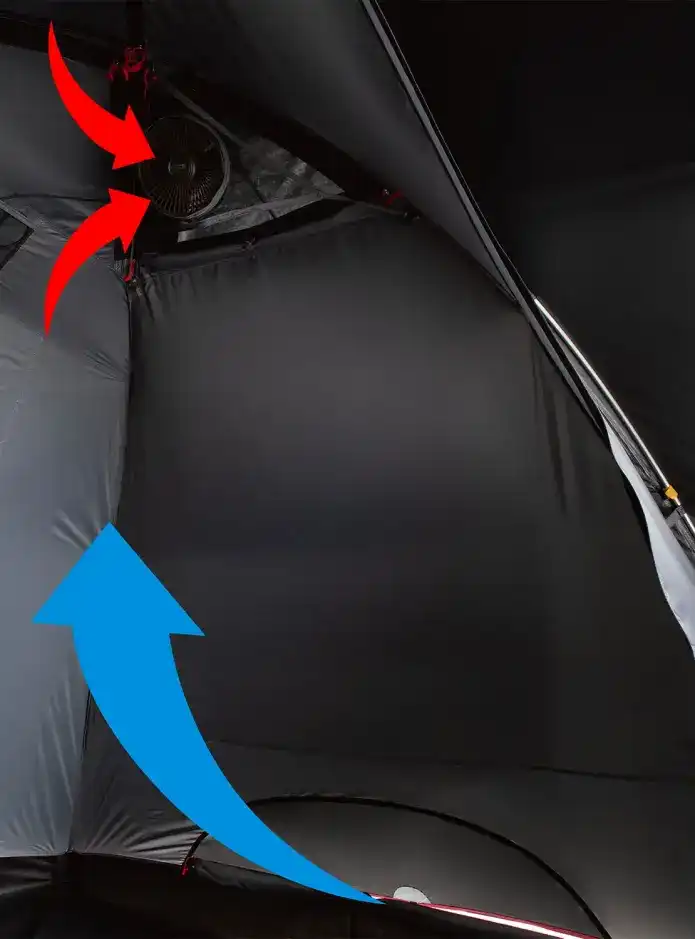インナーテントも吊り下げ式だから、5人用の寝室があっという間に完成。スカートもしっかり装備。寝室の約2倍の広大なリビングで、冬のおこもりキャンプにもピッタリです。