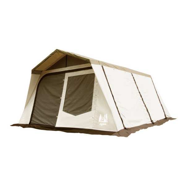 落ち着いたカラーリングの定番ロッジテント、ロッジシェルターT/C です。フレームがほぼ垂直に立ち上がるタイプのもので、デットスペースが少なく内部の居住空間が広いのが特徴的です。天井部分のテント下部のスカート以外はTC素材を使用しており、火の粉にも強い仕様に。かなりの重量がありますが、それさえ許容できれば間違いのない快適さを提供してくれるテントですよ。