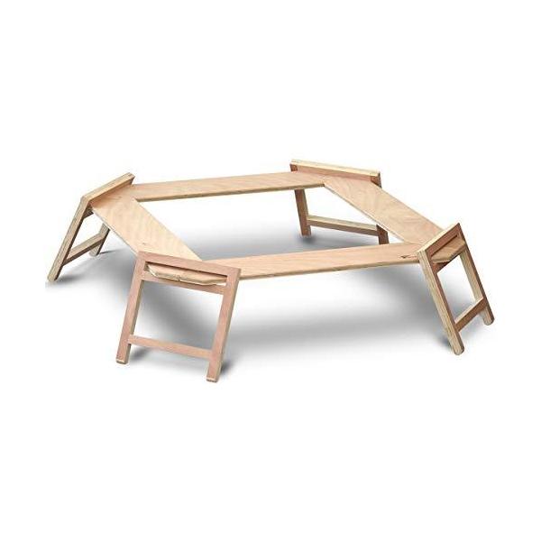 焚き火台を取り囲むように設置できる、囲炉裏タイプのキャンプ用テーブル。分割されたパネルで構成されており、簡単に組み立てられます。天板の高さが25cmと低く、チェアを使わず、あぐらをかいて使うのにも適しています。