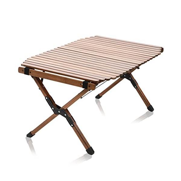 天板に木目のプリントをほどこし、天然木に近い見た目に仕上げたアルミ製テーブル。こちらの製品もロールトップタイプのため、コンパクトに収納できます。ロースタイルにもハイスタイルにも対応する2WAY仕様かつ、ソロキャンプにも使いやすいサイズが特徴です。