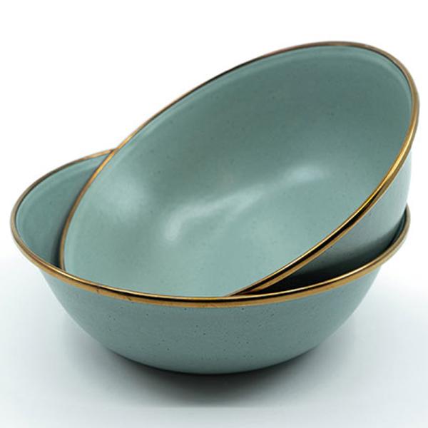 レイルロードランタンなどが人気の「ベアボーンズ」ですが、テーブルウェアも根強い人気があるんです。丈夫なエナメル製ながら品のある艶と、ヴィンテージ感漂う銅色のステンレスで補強されたリムが魅力のシリーズです。