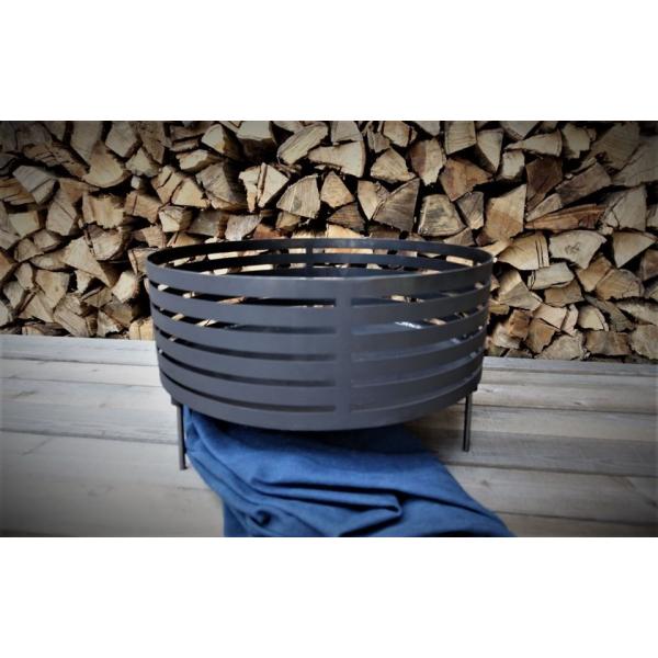 直線を基調とし、無駄のないシンプルでスタイリッシュなデザインは炎の美しさを引き立ててくれます。脚パーツが本体の側面の役目を果たすので、薪や灰が横から落ちることを防ぎながら熱による変形も防ぎます。