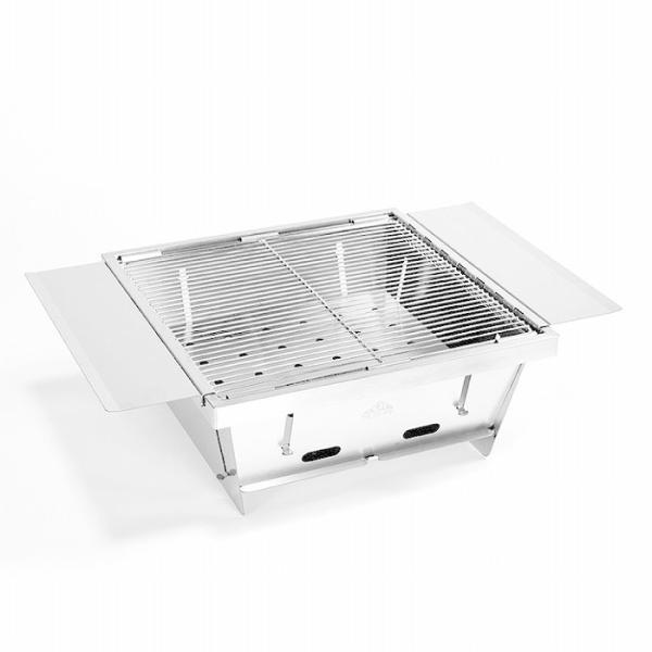 グリルの網はしっかり頑丈で、ダッチオーブンなどの重たいものもOK。サイドに用意されているプレートには、トングを乗せたりと簡易的なテーブルになるのも便利ですね。ソロ用のミニサイズもありますよ。