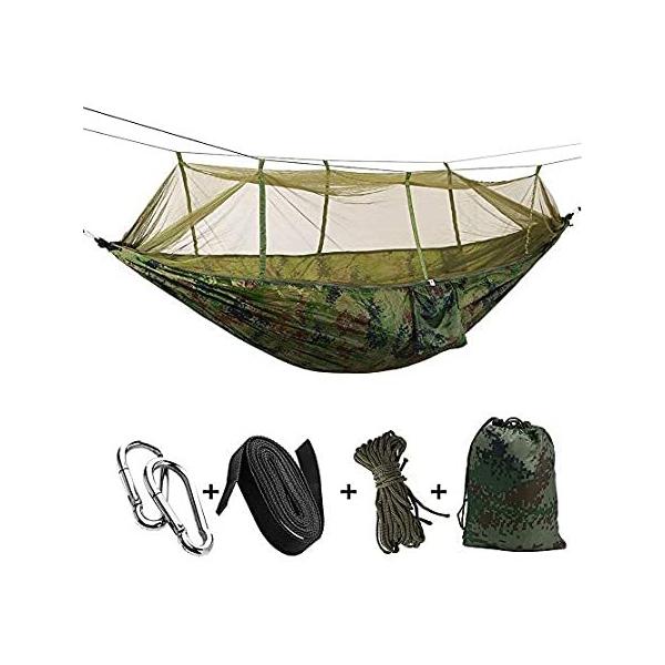 吊り下げハンモックに蚊帳やレインフライが付いていれば、屋外でも虫や天候を気にせずゆっくりリラックスできます。屋外で長時間ハンモックを使いたいときや、キャンプに持って行きたい方に最適なモデルです。